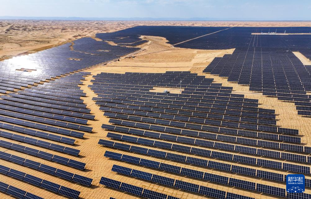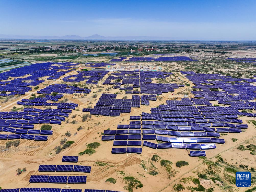 這是6月5日拍攝的位于巴彥淖爾市磴口縣的烏蘭布和東北部新能源基地100萬千瓦光伏先導(dǎo)工程項(xiàng)目,該項(xiàng)目地處烏蘭布和沙漠(無人機(jī)照片)新華社記者 連振 攝