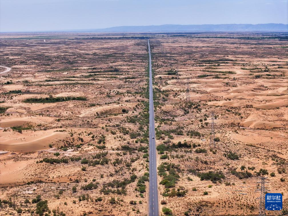 在巴彥淖爾市磴口縣,公路穿越烏蘭布和沙漠(6月5日攝,無人機(jī)照片)新華社記者 連振 攝