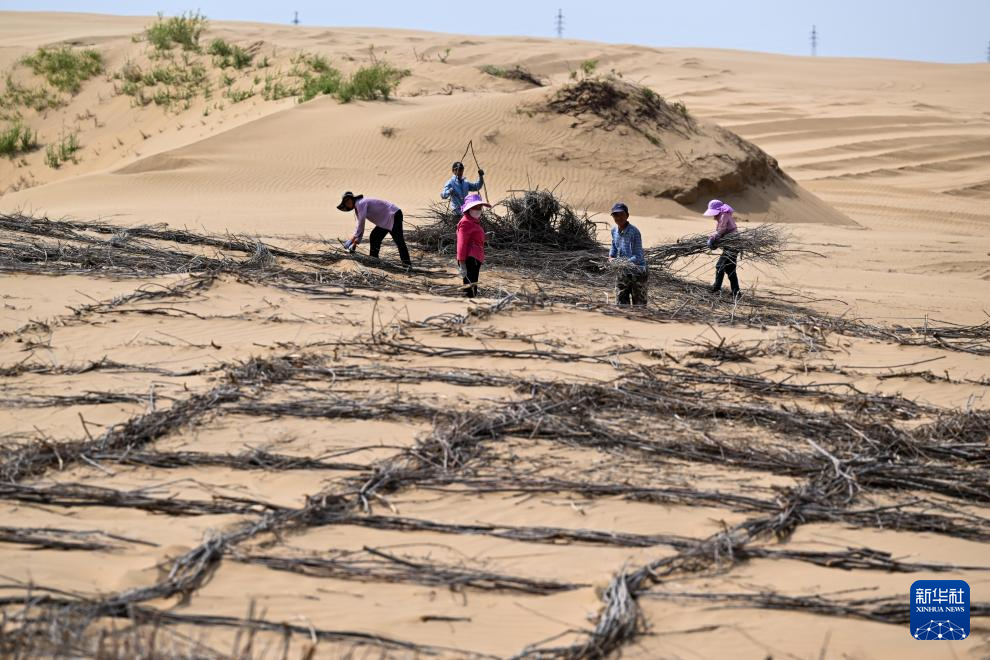 6月7日,在鄂爾多斯市達(dá)拉特旗境內(nèi)的庫布其沙漠,工人在治沙 新華社記者 李志鵬 攝