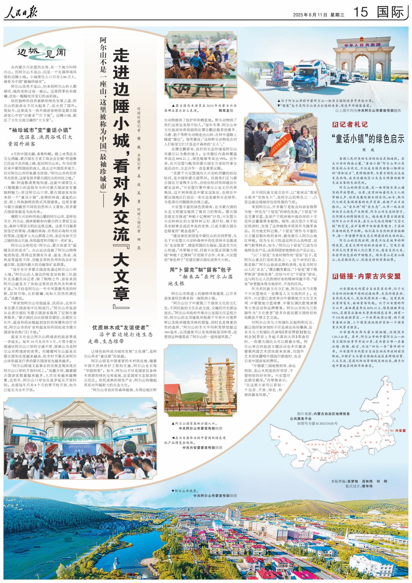 2025年6月11日,《人民日?qǐng)?bào)》第15版刊發(fā)整版文章《阿爾山不是一座山,這里被稱為中國“最袖珍城市”——走進(jìn)邊陲小城,看對(duì)外交流“大文章”》,報(bào)道了依托獨(dú)特的自然稟賦和綠色發(fā)展之道,阿爾山的旅游業(yè)火起來了?,F(xiàn)如今,這里成為一些外國游客特別是蒙古國游客心中的“治愈系”“打卡地”。邊陲小城,做出了文化交流交融的“大文章”。