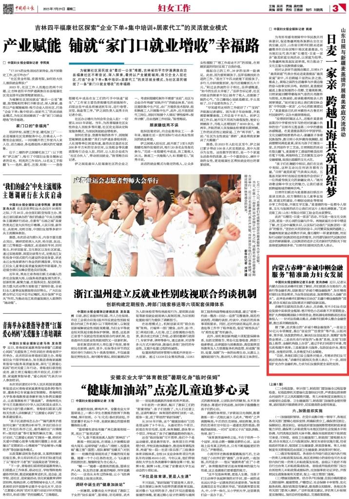 2025年7月29日,《中國婦女報》第3版刊發(fā)題為《內(nèi)蒙古赤峰“赤誠巾幗金融服務(wù)”精準(zhǔn)助力婦女發(fā)展》的新聞,報道了內(nèi)蒙古自治區(qū)赤峰市婦聯(lián)創(chuàng)新推出“赤誠巾幗金融服務(wù)”,旨在精準(zhǔn)對接婦女資金需求,為女性創(chuàng)業(yè)就業(yè)、發(fā)展增收注入金融“活水”。