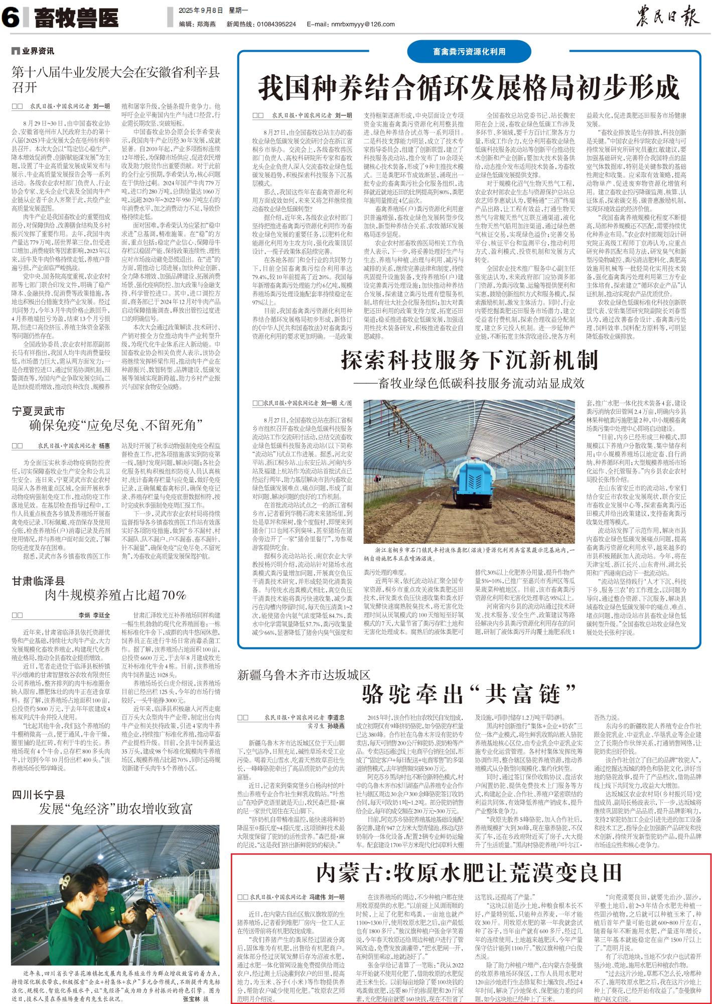 2025年9月8日,《農(nóng)民日報(bào)》第6版整版刊發(fā)題為《內(nèi)蒙古:牧原水肥讓荒漠變良田》的文章,報(bào)道了在內(nèi)蒙古奈曼旗的牧原養(yǎng)殖場環(huán)保區(qū),工作人員用水肥對120畝沙地進(jìn)行生態(tài)修復(fù)和土壤改良,經(jīng)過4年時(shí)間,解決了沙地保水、保肥能力差的問題,如今這塊地已經(jīng)種上了玉米。