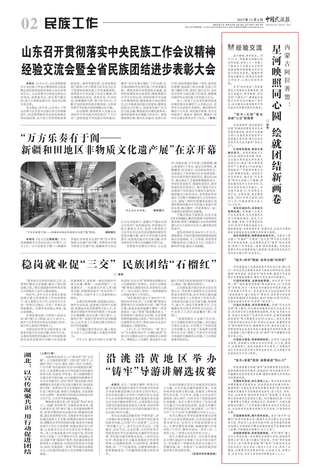 2025年11月4日,《中國民族報(bào)》第2版刊發(fā)題為《內(nèi)蒙古阿拉善盟:星河映照同心圓 繪就團(tuán)結(jié)新畫卷》的文章,報(bào)道了伴隨著各族群眾的歡呼吶喊,神舟二十一號載人飛船在位于內(nèi)蒙古自治區(qū)阿拉善盟額濟(jì)納旗境內(nèi)的東風(fēng)航天城成功發(fā)射。璀璨烈焰照亮北疆夜空,映照出各族群眾手拉手、心連心的團(tuán)結(jié)身影。