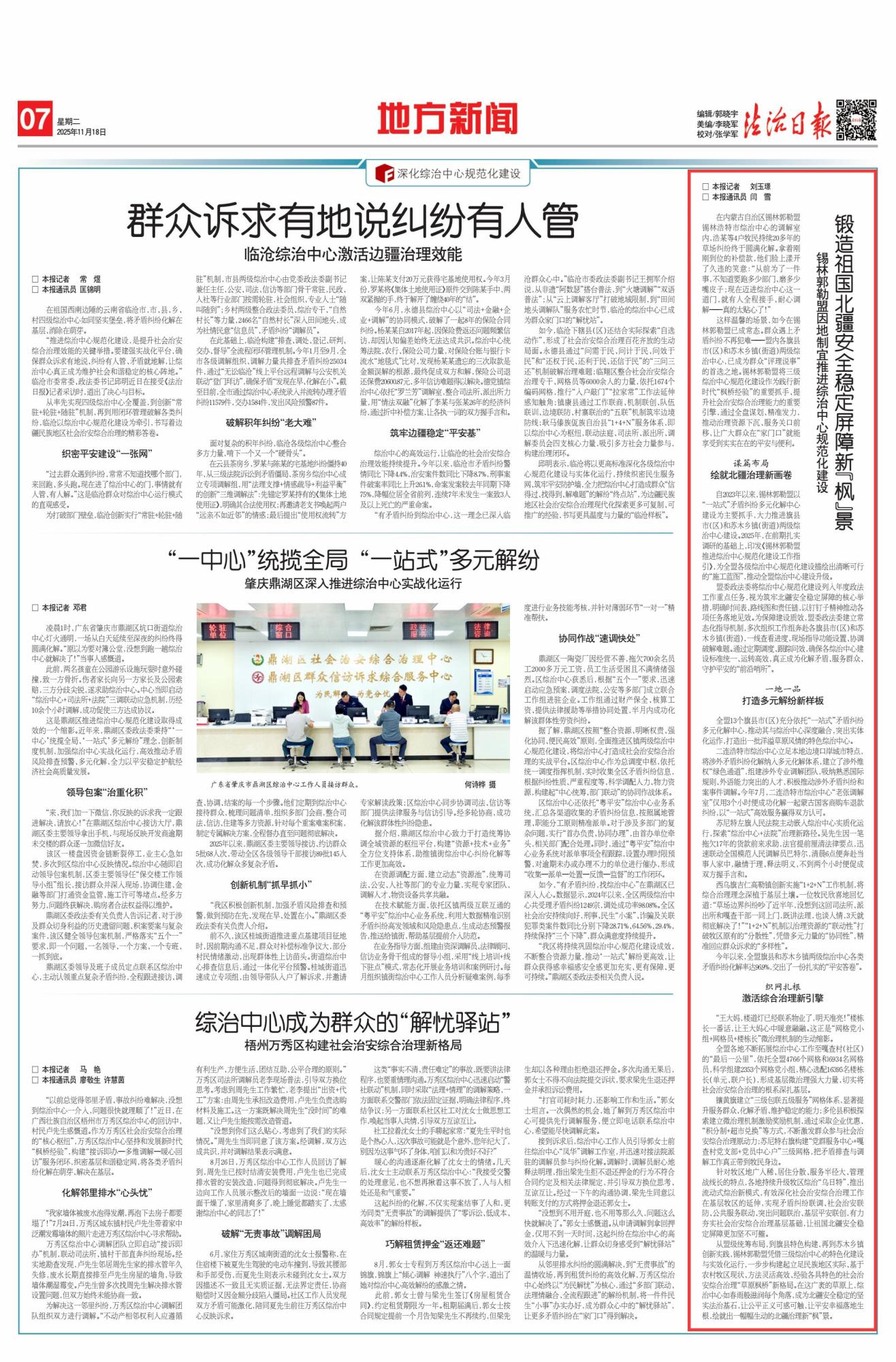 2025年11月18日《法治日?qǐng)?bào)》第7版刊發(fā)了《鍛造祖國北疆安全穩(wěn)定屏障新“楓”景 錫林郭勒盟因地制宜推進(jìn)綜治中心規(guī)范化建設(shè)》的文章,報(bào)道了自2023年以來,錫林郭勒盟以“一站式”矛盾糾紛多元化解中心建設(shè)為主要抓手,大力推進(jìn)旗縣市(區(qū))和蘇木鄉(xiāng)鎮(zhèn)(街道)兩級(jí)綜治中心建設(shè)。2025年,在前期扎實(shí)調(diào)研的基礎(chǔ)上,印發(fā)《錫林郭勒盟推進(jìn)綜治中心規(guī)范化建設(shè)工作指引》,為全盟各級(jí)綜治中心規(guī)范化建設(shè)描繪出清晰可行的“施工藍(lán)圖”,推動(dòng)全盟綜治中心建設(shè)升級(jí)。