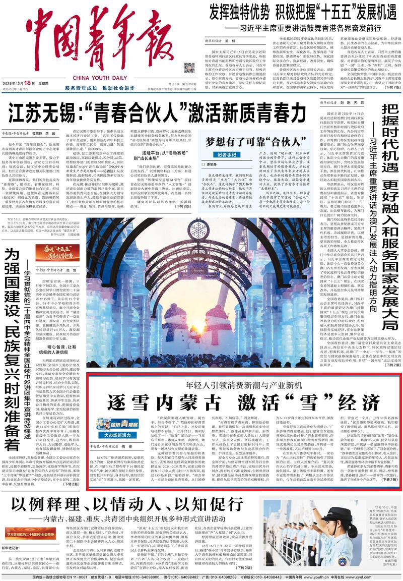 2025年12月18日《中國青年報》第1版刊發(fā)了《大市場新活力 年輕人引領(lǐng)消費新潮與產(chǎn)業(yè)新機 逐雪內(nèi)蒙古 激活“雪”經(jīng)濟》的文章,報道了烏蘭察布大河灣滑雪場是打造“冰雪+”復合體驗的縮影——將滑雪、火山、民俗與草原深度綁定,串聯(lián)成一條完整的冬季體驗鏈。