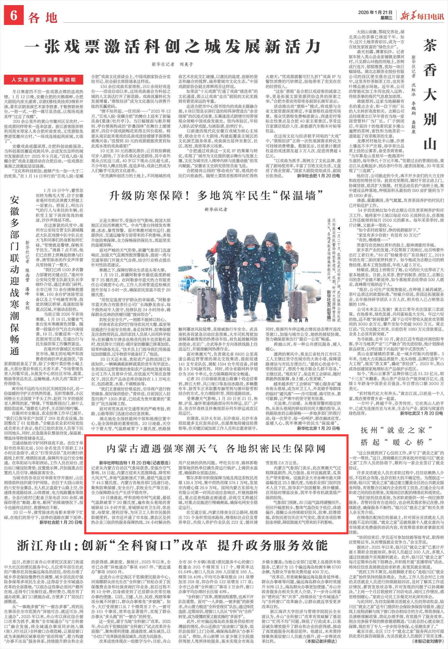2026年1月21日《新華每日電訊》第6版刊發(fā)了《內(nèi)蒙古遭遇強(qiáng)寒潮天氣 各地織密民生保障網(wǎng)》的文章,報(bào)道了內(nèi)蒙古迎來(lái)大范圍降溫、降雪和大風(fēng)天氣,多地氣溫?cái)嘌率较碌畹蜌鉁剡_(dá)零下44.5攝氏度。各地各部門(mén)迅速行動(dòng),聚焦防寒保暖、安全出行、農(nóng)牧業(yè)生產(chǎn)等方面,全力保障群眾生產(chǎn)生活平穩(wěn)有序。