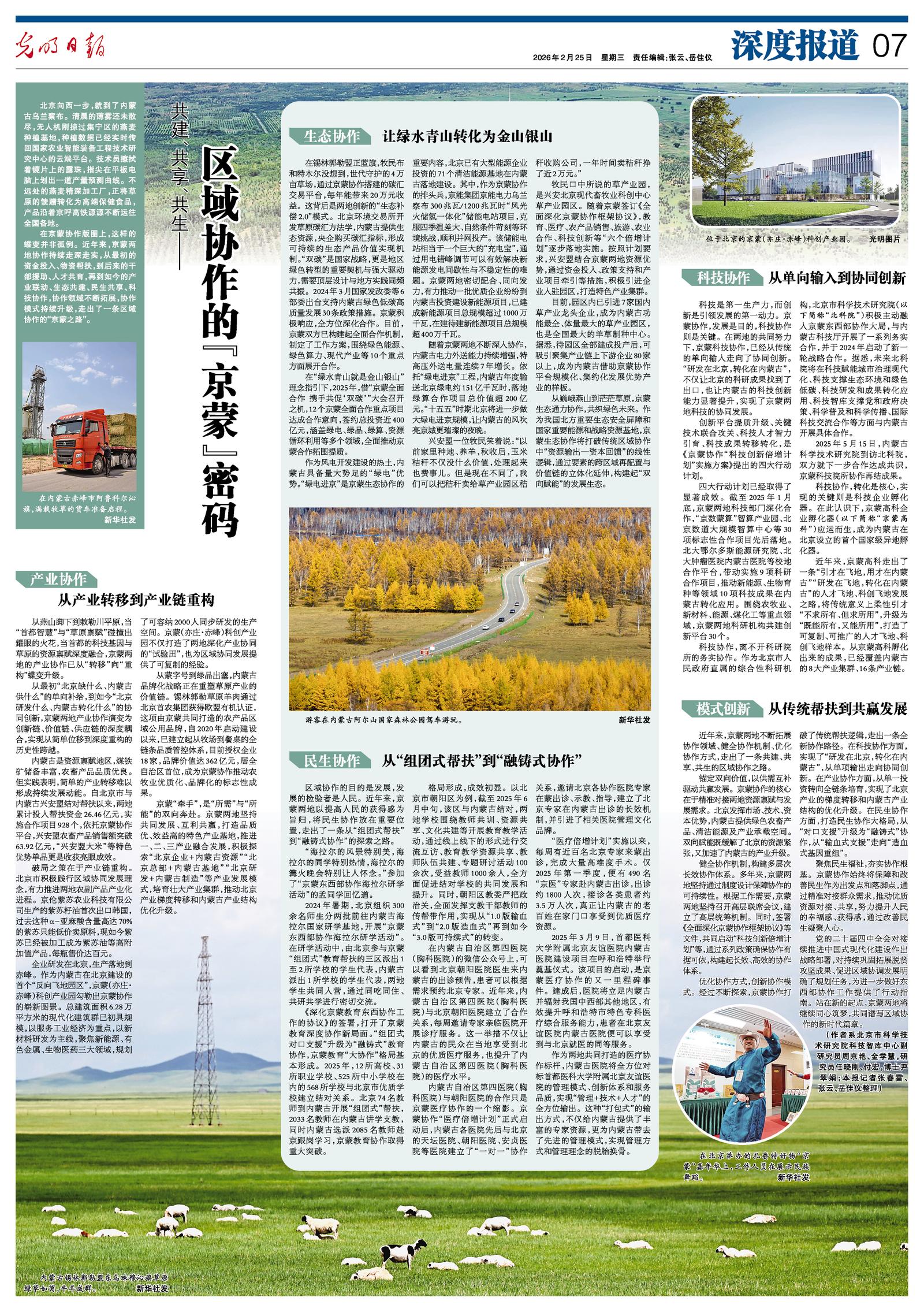 2026年2月25日《光明日報》第7版整版刊發(fā)了《共建、共享、共生——區(qū)域協(xié)作的“京蒙”密碼》的文章,報道了聚焦民生福祉,夯實協(xié)作根基。京蒙協(xié)作始終將保障和改善民生作為出發(fā)點和落腳點,通過精準對接群眾需求,推動優(yōu)質資源對接、共享,努力提升人民的幸福感、獲得感,通過改善民生凝聚人心。