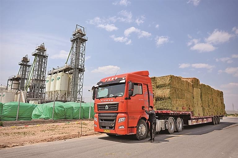 在內蒙古赤峰市阿魯科爾沁旗,滿載牧草的貨車準備啟程。新華社發(fā)