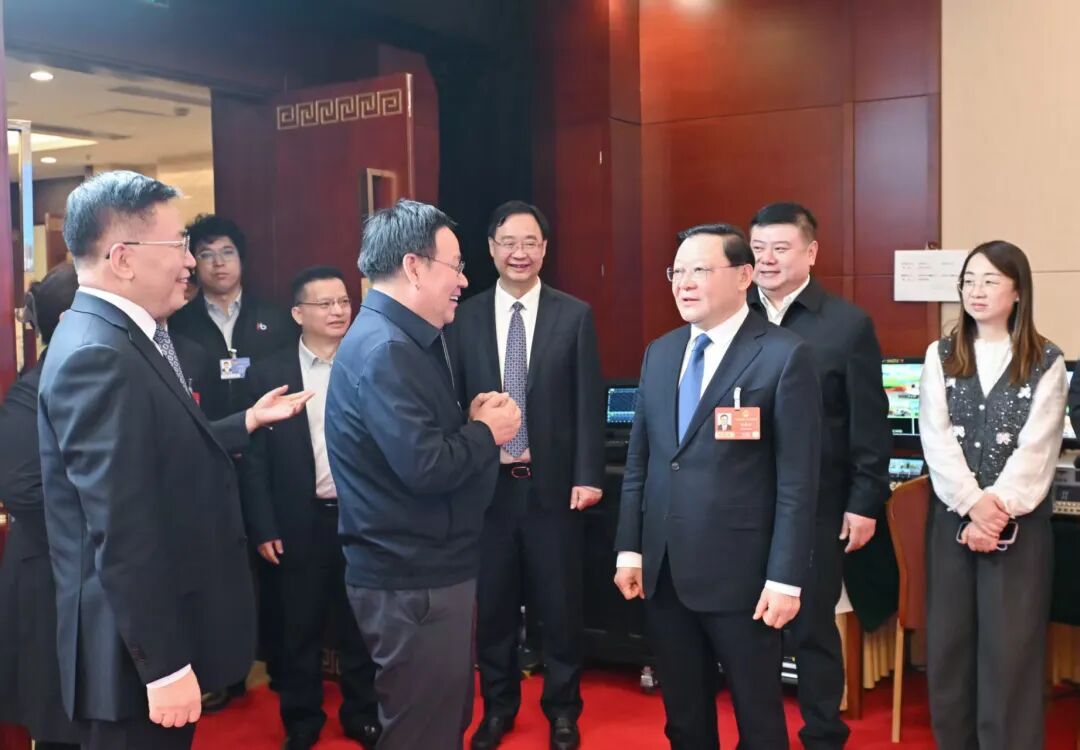 3月6日,自治區(qū)黨委書記、人大常委會主任王偉中,自治區(qū)黨委副書記、自治區(qū)人民政府主席包鋼在內(nèi)蒙古日報社兩會報道工作間與記者代表親切交流,詳細(xì)了解宣傳報道情況。草原云·內(nèi)蒙古新聞網(wǎng)記者 馬建兵 攝