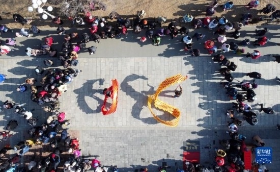 2月21日,在天津市水上公園,民間藝人表演空竹舞龍(無人機照片)。