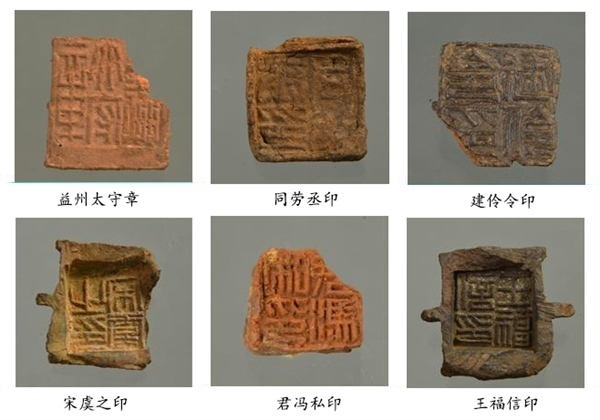 封泥集中出土于北部發(fā)掘區(qū)東北角的河道廢棄堆積中,共計837枚。主要為官印封泥和私印封泥,其中官印封泥有“益州太守章”“建伶令印”“同勞示印”等,涵蓋了漢代益州郡 24 縣中的20個縣名。出土帶字簡牘殘片 1000 余枚,不帶字的簡牘殘片近萬枚。其中,帶字簡牘中釋讀出“滇池以亭行”“建伶”“始元四年”等文字,應是公文文書。
