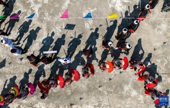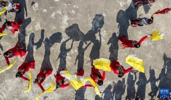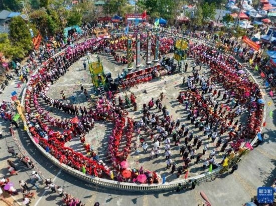 3月2日,當(dāng)?shù)厝罕娕c來自各地的游客踩著相同的鼓點進(jìn)場舞蹈(無人機照片)。