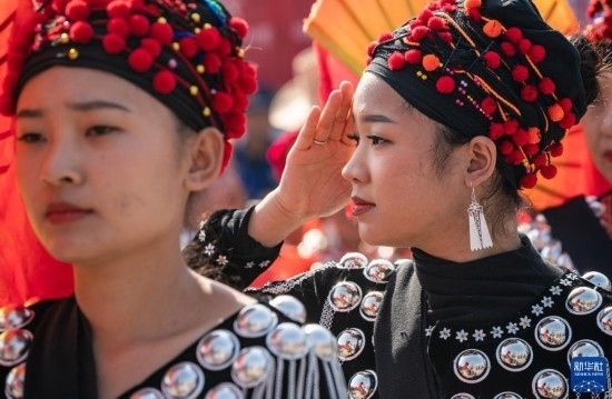 3月2日,參加目瑙縱歌節(jié)的婦女手持折扇進(jìn)場舞蹈。