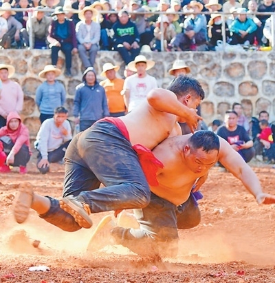 紅河哈尼族彝族自治州彌勒市西三鎮(zhèn)正在舉行彝族傳統(tǒng)摔跤比賽活動(dòng)。普佳勇攝(人民視覺)