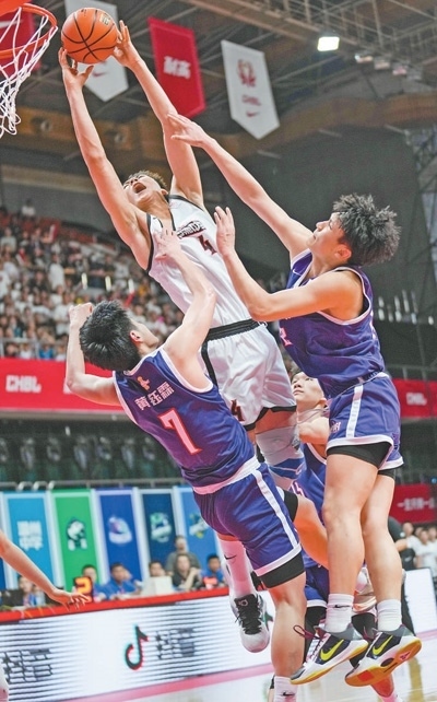 5月14日,北京首鋼籃球中心,回浦中學隊球員淡厚然(左二)在決賽中完成補籃。新華社記者 孟永民攝