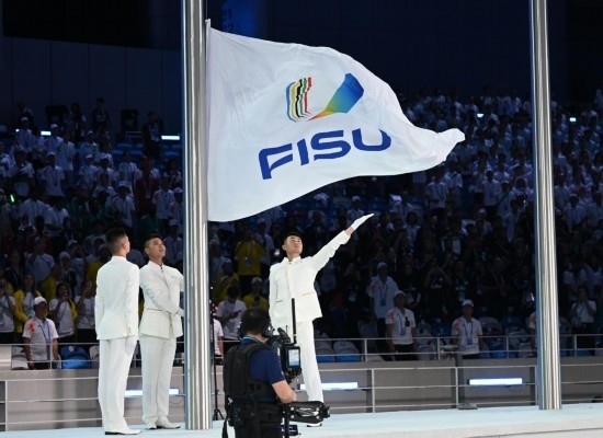 隨后,在國際大學生體育聯(lián)合會會歌聲中,會旗冉冉升起,迎風飄揚。