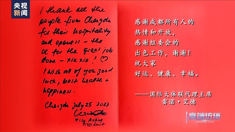 國際大體聯(lián)代理主席雷諾·艾德在接受總臺(tái)專訪后題詞:感謝成都所有人的熱情和開放,感謝組委會(huì)的出色工作,謝謝!祝大家好運(yùn)、健康、幸福。
