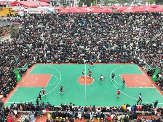 這是3月27日在貴州省黔東南州臺江縣臺盤村拍攝的貴州省首屆“美麗鄉(xiāng)村”籃球聯(lián)賽總決賽比賽現(xiàn)場(無人機(jī)照片)。新華社記者歐東衢攝