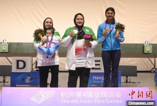 薩雷赫(左一)與兒子參加杭州第4屆亞殘運(yùn)會(huì)SH1級(jí)女子10米氣手槍頒獎(jiǎng)儀式。 王剛 攝