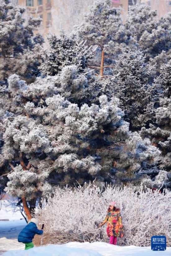 當日,降雪后的冰城哈爾濱市出現(xiàn)霧凇景觀,大地銀裝素裹,玉樹瓊枝美如畫卷。