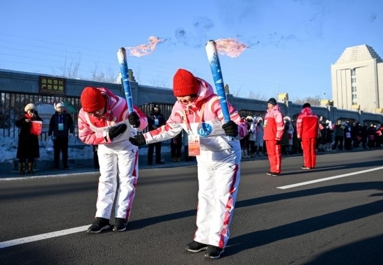 2月3日,在內(nèi)蒙古呼倫貝爾市滿洲里國(guó)門景區(qū),火炬手包玲玲(右)和錢卓在火炬?zhèn)鬟f活動(dòng)中。新華社記者 連振 攝