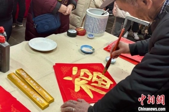 2月10日,大年初一,北京廠甸廟會開門迎客。圖為書法家為市民和游客寫福、送福。中新社記者 徐婧 攝