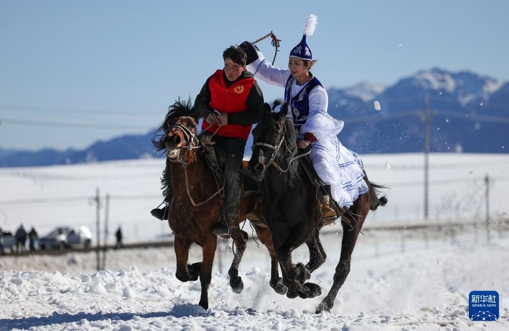 農(nóng)歷大年初二,新疆烏魯木齊縣“春節(jié)八天樂”系列活動——傳統(tǒng)體育民俗鬧新春在甘溝鄉(xiāng)進(jìn)行。村民們在冰雪覆蓋的烏拉斯臺草原上進(jìn)行雪地賽馬、“姑娘追”、馬上拾銀、叼羊等比賽,歡度新春。