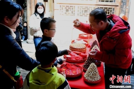 福建民俗博物館內(nèi)喜籮攤位前吸引孩子觀看,感受傳統(tǒng)年味。 中新網(wǎng)記者劉可耕攝
