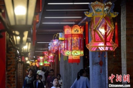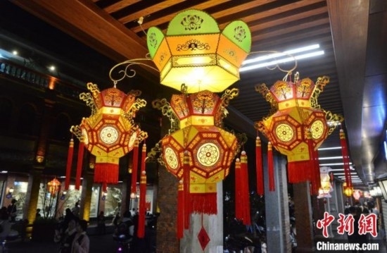 圖為2月20日晚,泉州中山路騎樓兩側,花燈流光溢彩,美不勝收。 中新網(wǎng)記者 張斌 攝