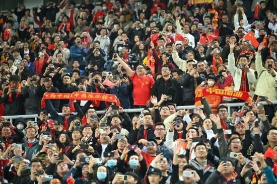 當(dāng)球員入場時,球迷們將寫著“為中國而戰(zhàn)”的紅色圍巾高舉頭頂,場面壯觀。印有“精忠報(bào)國”的巨幅球員畫像在球迷看臺隨“人浪”翻滾。奏國歌環(huán)節(jié),一面巨大的五星紅旗被高高撐起在看臺上,數(shù)萬名球迷齊唱國歌,中國隊(duì)11名首發(fā)球員注視著這個方向,一同歌唱。