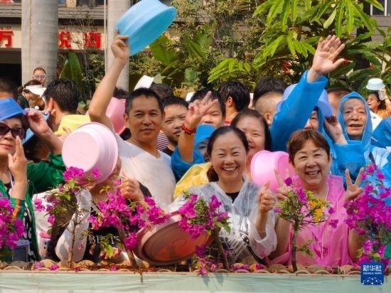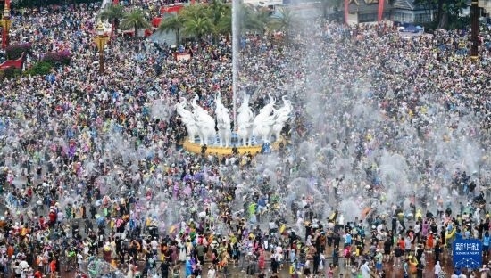 當(dāng)日,云南省西雙版納傣族自治州舉行潑水狂歡活動(dòng),人們歡聚在景洪市潑水廣場,用相互潑水的方式互送祝福,慶祝潑水節(jié)。