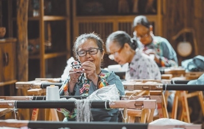 村民在酉陽苗繡非遺工坊繡制產(chǎn)品。游力克攝(影像中國)