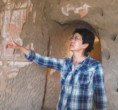 克孜爾石窟內,趙莉(見圖)對著壁面上的切割痕跡,與電腦里的數百張照片來回比對,題材內容、顏色、紋飾圖案,都要一一對應。突然,腦海中一張照片精準鑲嵌進了缺失的那塊壁面——這樣的“靈感突現”,源于她對每個洞窟每幅壁畫以及被揭取痕跡的熟悉程度。在克孜爾石窟群穿梭了32年,作為克孜爾石窟研究院研究館員,每一個洞窟都深深刻印在了她的腦海中。