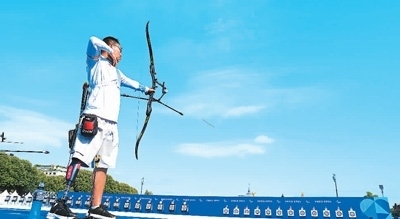 當(dāng)?shù)貢r間8月24日,在法國巴黎榮軍院旁的射箭訓(xùn)練場內(nèi),中國殘奧射箭隊在進行適應(yīng)性訓(xùn)練。拉弓、瞄準(zhǔn)、松弦,中國隊選手甘俊射出正中靶心的一箭后,臉上露出笑容。他表示:“風(fēng)速、風(fēng)向?qū)穆潼c影響較大,我會盡快適應(yīng),調(diào)整到最佳狀態(tài)。”甘俊對自己參加的首屆殘奧會充滿期待。
