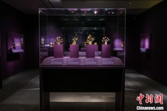 當地時間9月4日,百余件遼寧三燕文物亮相紐約華美協(xié)進社中國美術館秋季特展《龍城之金:遼寧三燕文物選萃,337-436》。圖為展覽現場的金步搖。 中新社記者 王帆 攝