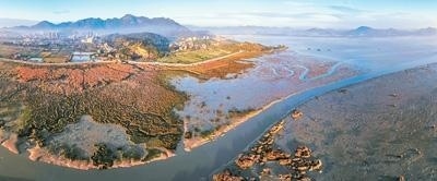 圖為閩江入海口廣闊的灘涂、被稱為“閩江口明珠”的瑯岐島以及日益繁榮的城鎮(zhèn)。