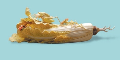 細細端詳,白菜葉莖上,還飾有兩朵小花,一朵含苞,一朵盛放;菜葉與主體的結合部位,趴伏著一只翠色蟈蟈,蟈蟈雙腿一屈一蹬,正盡情吮吸白菜鮮美的汁水;一只瓢蟲一旁靜臥,須角隱現(xiàn),似乎也在埋頭享用大餐。小花和小蟲的點綴,使得整個作品兼顧野趣和雅致,充滿生命的律動與自然的和諧。