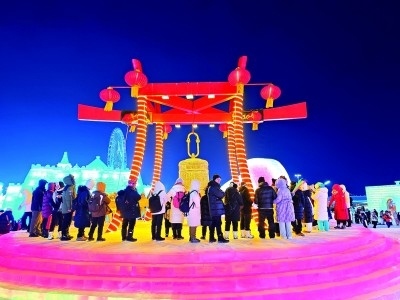 游客在哈爾濱冰雪大世界參加祈?;顒印?/p>