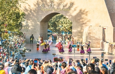 新疆維吾爾自治區(qū)喀什古城景區(qū)舉行形式多樣的文化演出活動,打造演藝品牌,促進(jìn)文旅融合發(fā)展。圖為游客觀賞古城開城儀式演出。