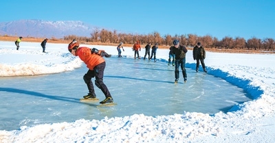 滑冰愛好者在甘肅省張掖國(guó)家濕地公園滑冰健身。