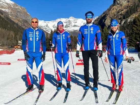 2022年1月24日,泰國越野滑雪隊(duì)運(yùn)動(dòng)員卡倫·尚隆(左二)、馬克·尚?。ㄗ笕┡c父母在歐洲備戰(zhàn)訓(xùn)練時(shí)合影。新華社發(fā)(受訪者供圖)