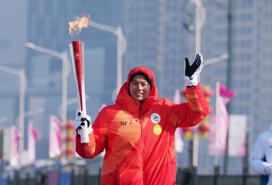 火炬手汪順在傳遞火炬。新華社記者 王松 攝