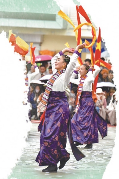 春節(jié)假期,每到傍晚時分,四川省阿壩藏族羌族自治州若爾蓋縣城中心的北上廣場都會準時響起歡快的鍋莊曲,遠道而來的游客與當(dāng)?shù)厝罕娨黄鹛饸g快的鍋莊。伴著音樂,鮮艷的長袖在風(fēng)中劃出道道弧線,腰飾隨著舞步搖曳,男女老少圍成一圈、翩然起舞。