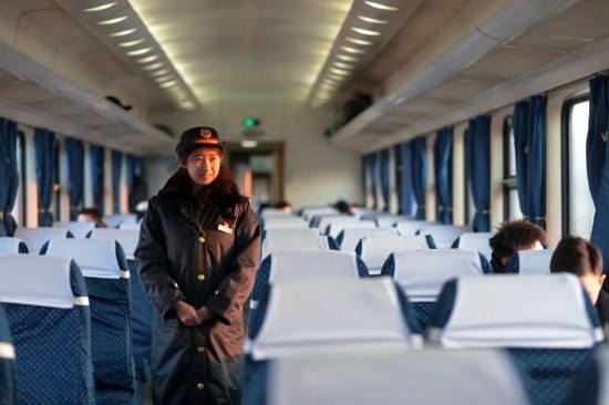 除夕當(dāng)天,復(fù)興號(hào)上的乘務(wù)員送出祝福。