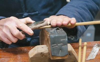 根據(jù)筆頭大小,使用工具將筆桿鑿出相應(yīng)尺寸的孔。