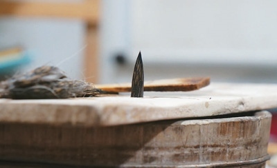 制作筆頭從理毫開始,將毛的根部理齊。然后整理毛的頭部,這一步叫齊毫。齊毫后的筆毛變成一片一片的,方便做成圓錐形。圖為齊毫。