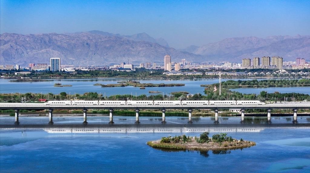 2024年10月3日,一列動(dòng)車(chē)組列車(chē)行駛在包銀高鐵惠銀段石嘴山特大橋上(無(wú)人機(jī)照片)。新華社記者馮開(kāi)華攝