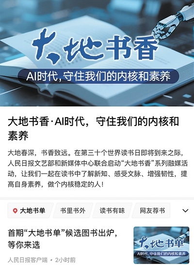 習(xí)近平總書記在今年全國兩會期間的重要講話中指出“書香是一種氛圍”“數(shù)字閱讀要和傳統(tǒng)閱讀結(jié)合起來,守住我們的內(nèi)核和素養(yǎng)”。在第三十個世界讀書日即將到來之際,人民日報社文藝部和新媒體中心聯(lián)合啟動“大地書香”系列融媒活動,并圍繞“AI時代,守住我們的內(nèi)核和素養(yǎng)”推出首期“大地書單”。來自出版、文藝、科技、教育等不同領(lǐng)域的20位薦書人,推薦出35本候選圖書,在人民日報客戶端“大地書香”專題予以集中呈現(xiàn),參照網(wǎng)友的評論與推薦,最終推選出10本上榜圖書。讓我們多讀書、讀好書,一起在氤氳著書香的大地上行穩(wěn)致遠(yuǎn)。