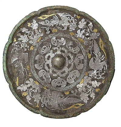 在金銀交相輝映下,這面銅鏡時至今日依然流光溢彩,其奧秘就在于“金銀平脫”工藝。即用金銀薄片裁成紋樣,粘貼于銅器漆面上,周邊再用漆涂滿,經(jīng)研磨拋光再鏨花,形成富麗堂皇、精麗雅致的藝術(shù)效果。它從最早出現(xiàn)于商代的金銀箔貼花技術(shù)演變而來,后經(jīng)歷了戰(zhàn)國、漢代較長時期的發(fā)展。到了唐代,工匠將“金銀平脫”創(chuàng)造性地運用在銅鏡之上。