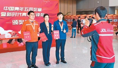 2025年4月30日,中國青年五四獎?wù)卖咝聲r(shí)代青年先鋒獎?lì)C獎儀式在京舉行。趙亞杰(中)在頒獎現(xiàn)場合影留念,拍攝照片的是快遞小哥欒玉帥,他也獲得了2025年度中國青年五四獎?wù)隆?/p>
